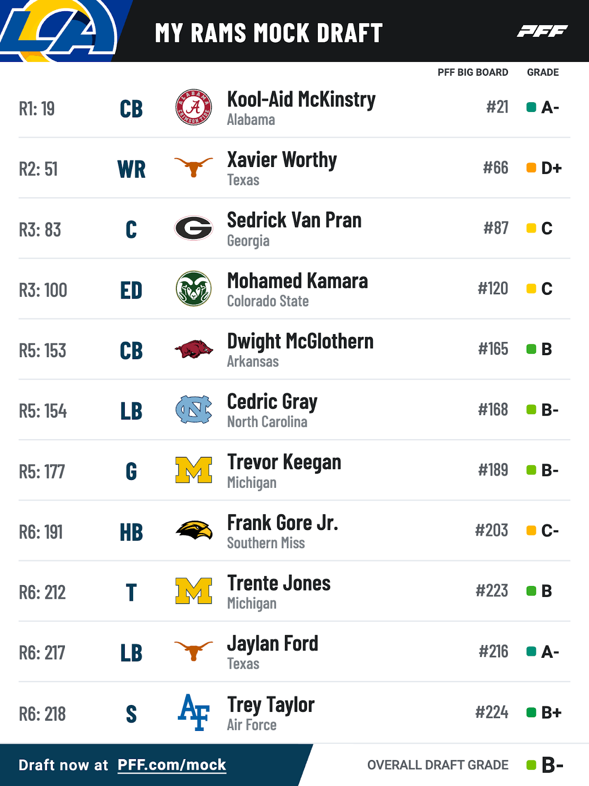 At wide receiver, the Rams should look to find a speedster to stretch the field for Kupp and Nacua. I think Texas wide receivers, Xavier Worthy and Adonai Mitchell, are perfect prospects for the Rams and could be there at pick 52 in the second round.