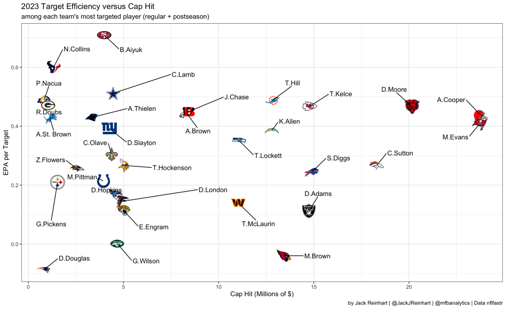 Since the beginning of the Matthew Stafford era in 2021, he and Cooper Kupp have been the stars of the show on offense. However, this changed drastically in 2023 when fifth-round rookie Puka Nacua stole the show, breaking the rookie receiving record with 1,473 yards. One of the biggest reasons why this was so pivotal for the Rams is that it didn’t cost them much money at all. Nacua had a cap hit of under $1 million in 2023 and will still remain under $1 million for the 2024 season. The graph below shows every team’s most targeted receiver’s efficiency (EPA per target) in 2023 versus their cap hit for that year.