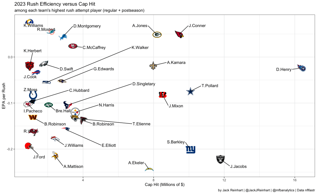 In the fifth round of the 2022 draft, Rams general manager, Les Snead, found Kyren Williams, who has emerged as one of the league’s best running backs. Similar to his teammate Puka Nacua, he is saving the team a lot of money. The graph below has the same principle as the previous graph, but analyzes the running back position instead, with EPA per rush rather than per target.
