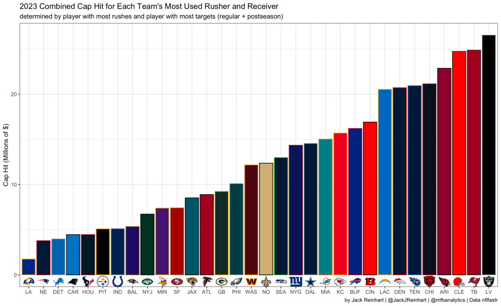 Among each team’s highest workload running back in 2023, Williams had the highest EPA per rush, while costing the team under $1 million in cap. It is because of this elite, cheap pairing of young skill position players that the Rams offense was so strong in 2023. Below is the combined cap hit for each team’s highest volume rusher and receiver last season.