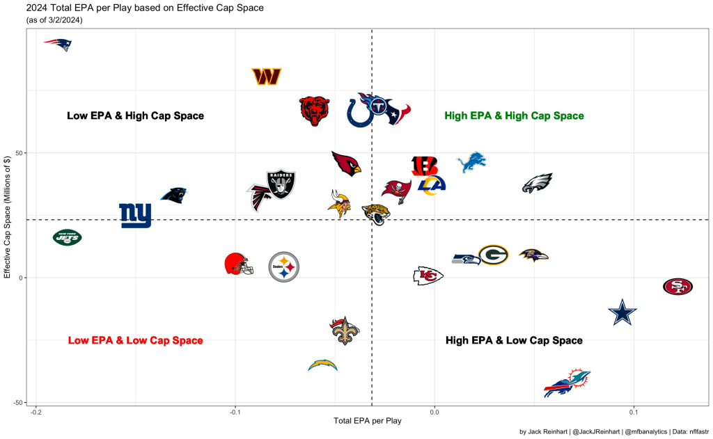 The Rams find themselves in great company, being in the upper right quadrant with teams like the Lions, Bengals, and Texans. The transition from their Super Bowl victory to now setting themselves up for a great offseason (including still holding their first-round pick) displays that sometimes a team’s most important assets are the head coach and general manager.