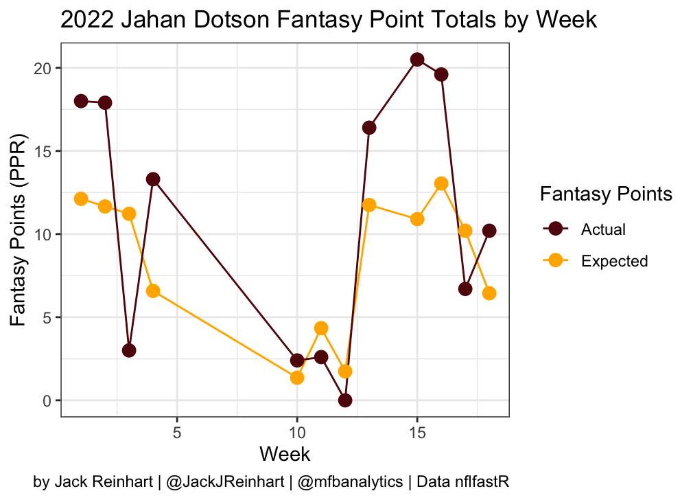 Dotson exceeded his moderate expectations in his first season, especially after becoming fully healthy. I graphed his actual vs expected fantasy points below. Make sure to disregard the negative trend of both actual and expected fantasy points from weeks four to 10 in 2022, as this is because he didn’t play in weeks five through nine.