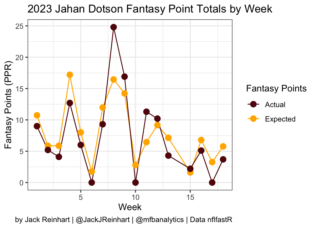 In 2023, it was very clear that Jahan Dotson didn’t have the expected fantasy points (and therefore opportunity) to succeed. Especially after week 12, Dotson really was hung out to dry in terms of opportunity, not reaching an expected fantasy point total higher than five.