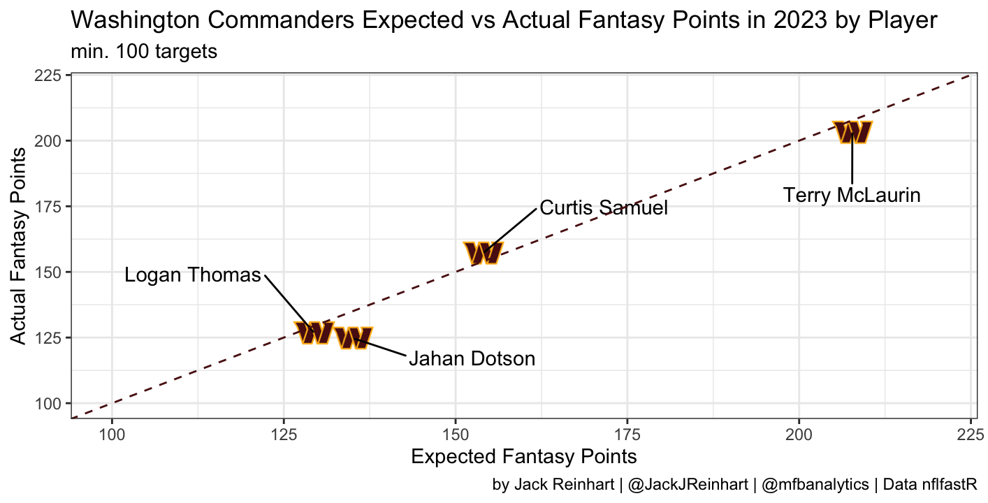 The visualization above shows the Commanders receiving leaders’ fantasy points versus expected fantasy points in 2023. As can be seen, Samuel slightly outperformed his expected total while Dotson slightly underperformed.