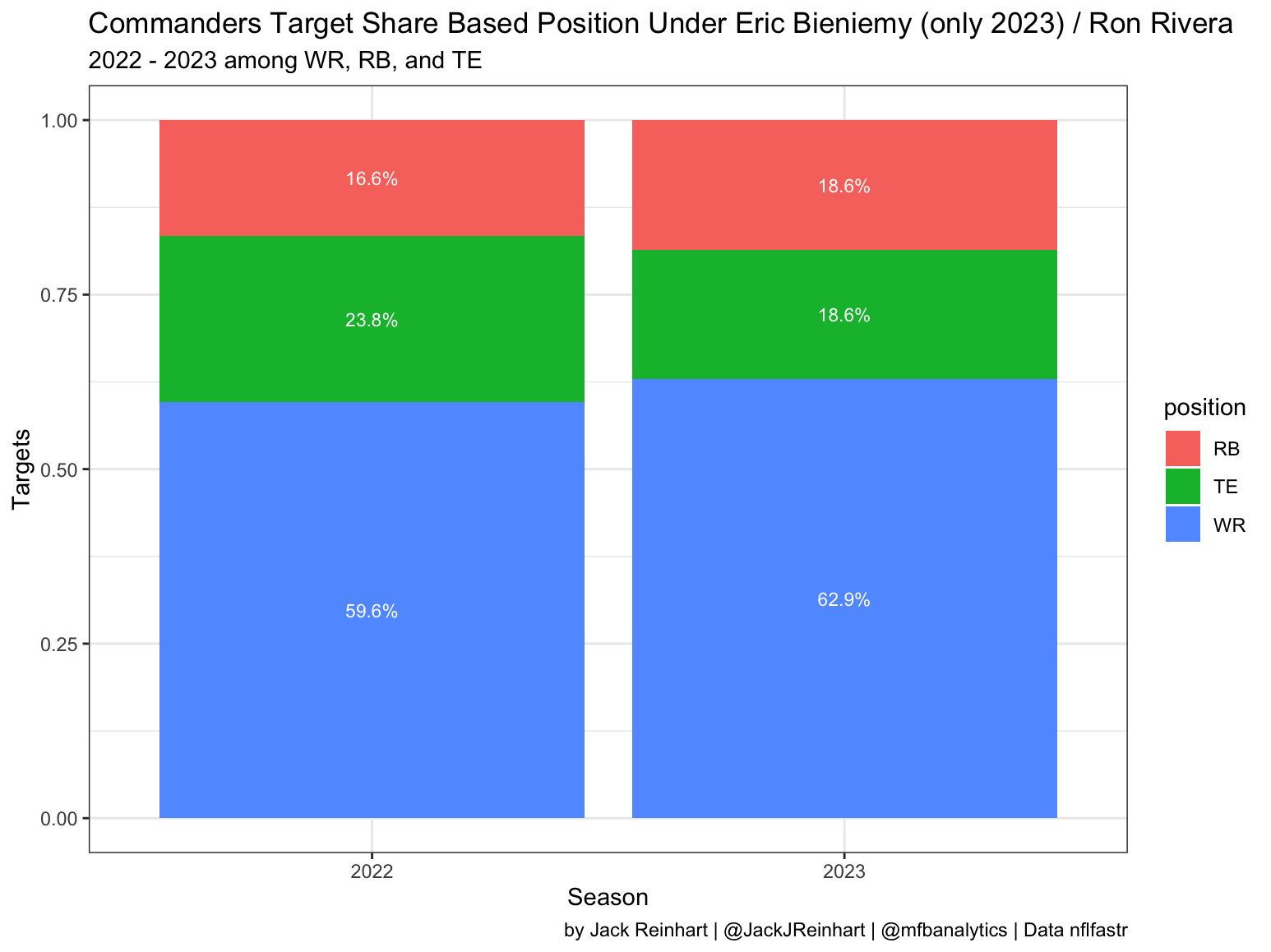 Except for an outlier year in 2021, receivers got approximately 72% of targets among pass catchers during Kingsbury’s tenure in Arizona. Considering the same graph from the last two years of the Commanders offense (pictured below), receivers got the ball at a much lower rate.