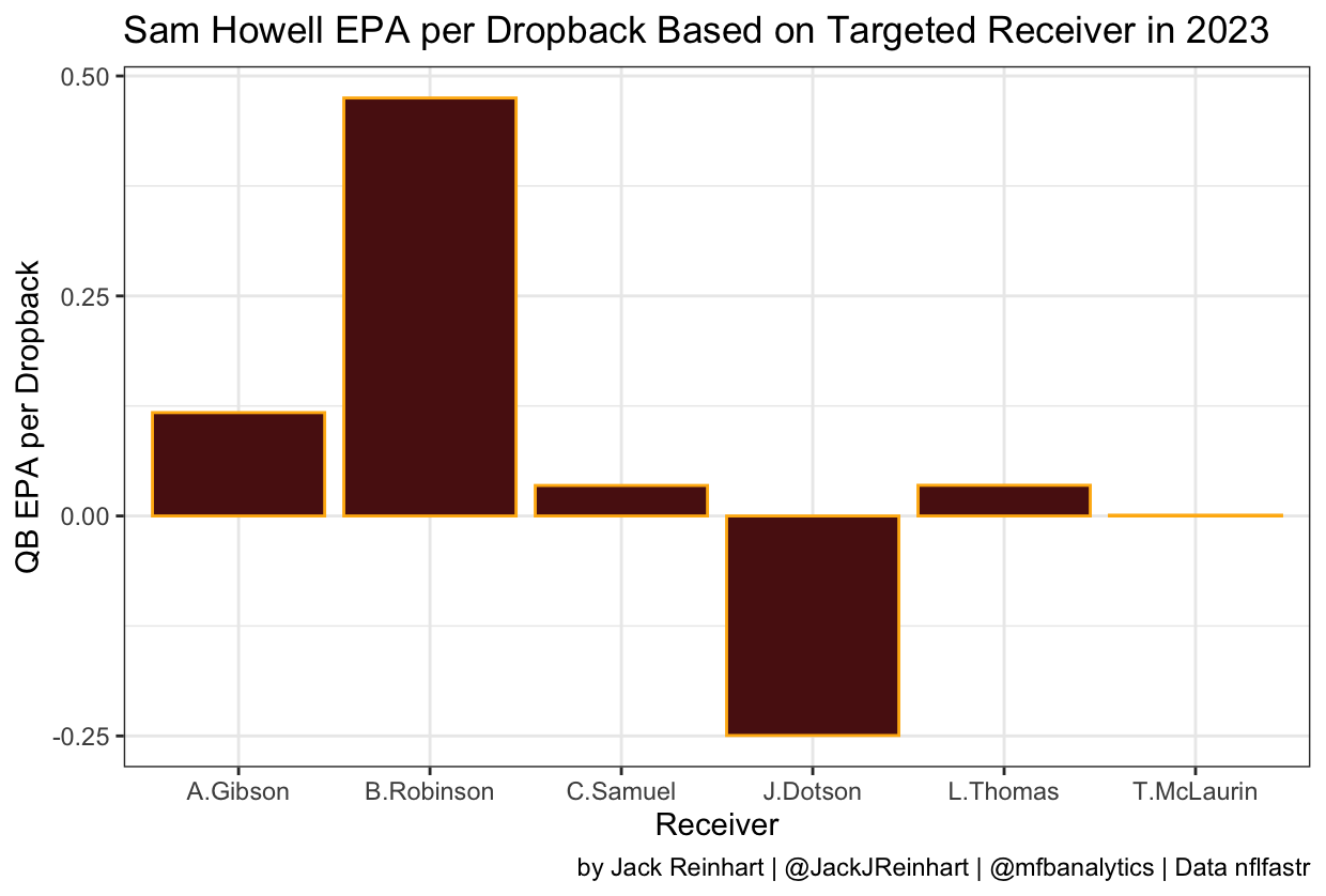 Below are two graphs, each examining quarterback EPA per dropback based on the targeted receiver. This basically examines how efficient a quarterback is with his passes based on the receiver of those passes. It is important to remember that QB EPA isn’t solely based on quarterback play, but it gives us a decent idea. The first graph is of Taylor Heinicke in 2022, while the second is of Sam Howell in 2023.