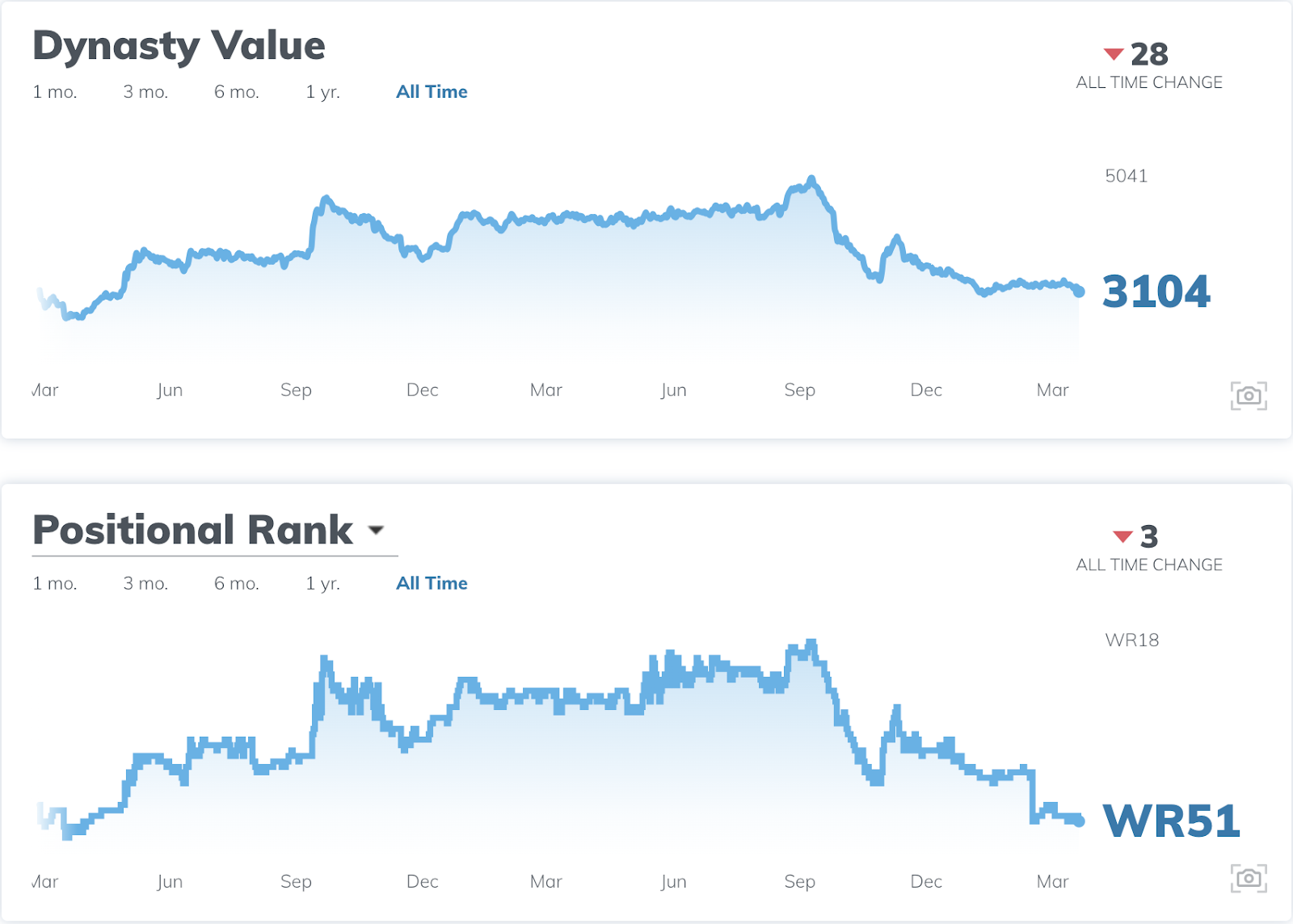 Dotson got a huge boost in September of his rookie season due to his surge of fantasy points, but fell shortly after because of his injury. However, he quickly regained his value after a strong finish to the year. This value rose over the offseason between his freshman and sophomore seasons, but ultimately nosedived due to an unsuccessful year with Howell.