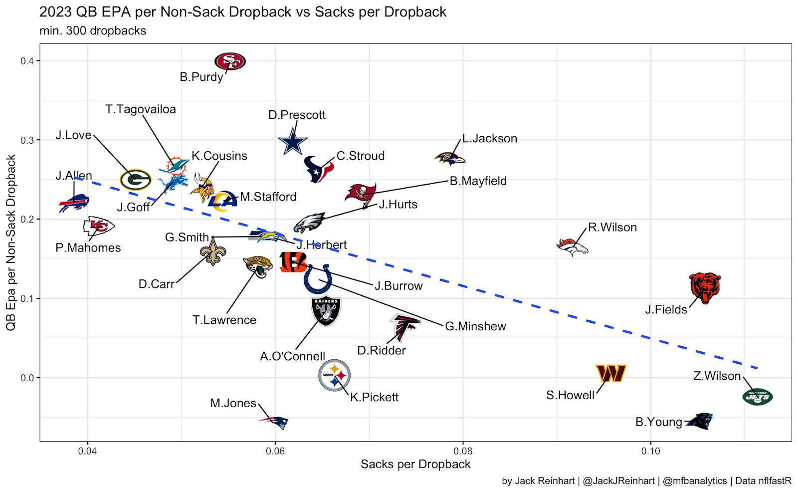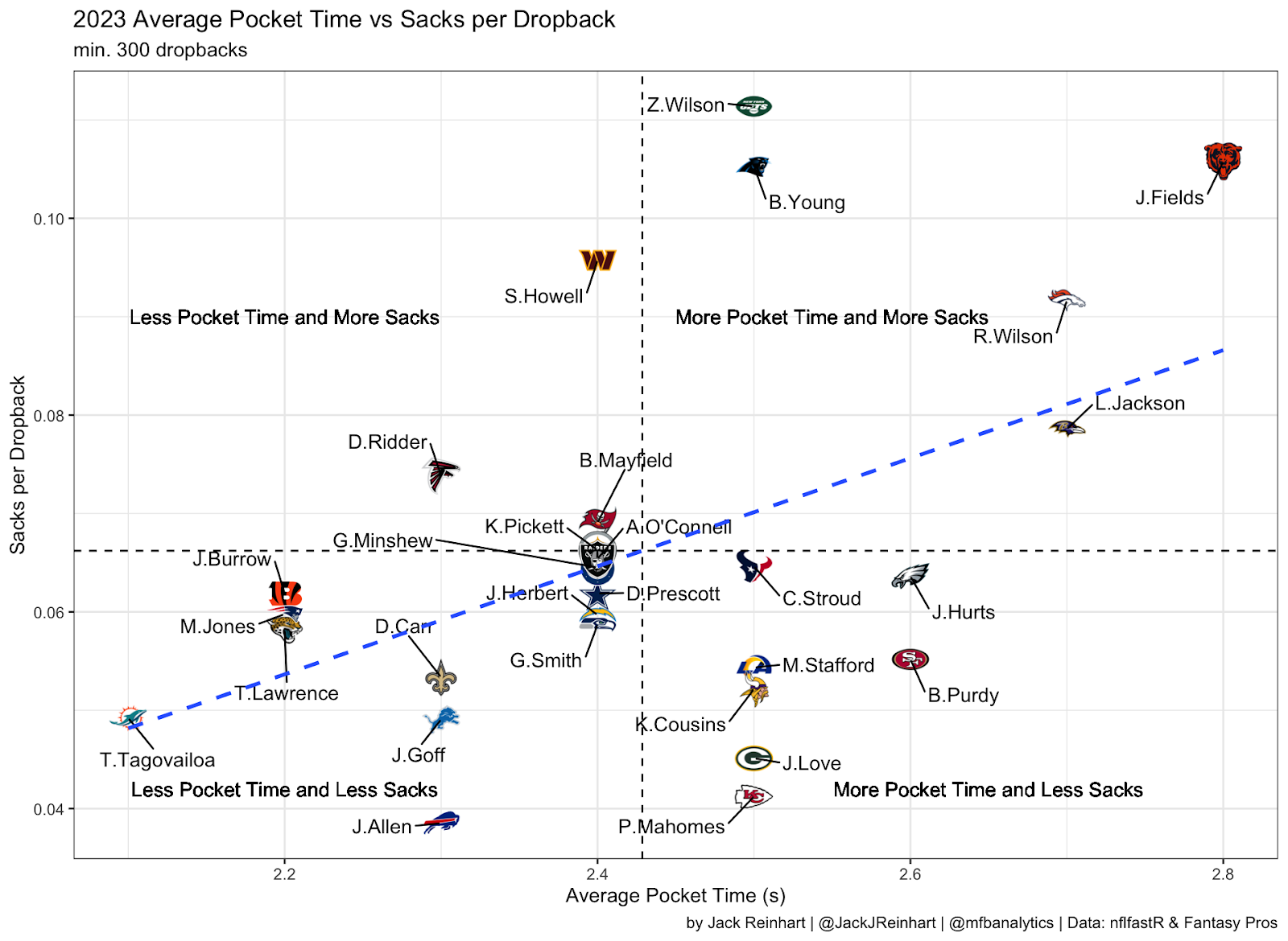 The above data visualization shows average pocket time versus sacks per dropback in 2023. Sam Howell took a large quantity of sacks relative to the time he had in the pocket. Unlike many of the other quarterbacks with similar pocket time and far lower sacks per dropback, Howell was unable to extend plays, and took many more sacks resultantly.