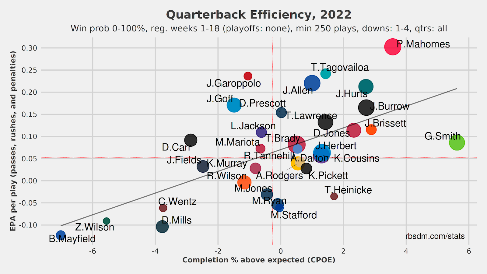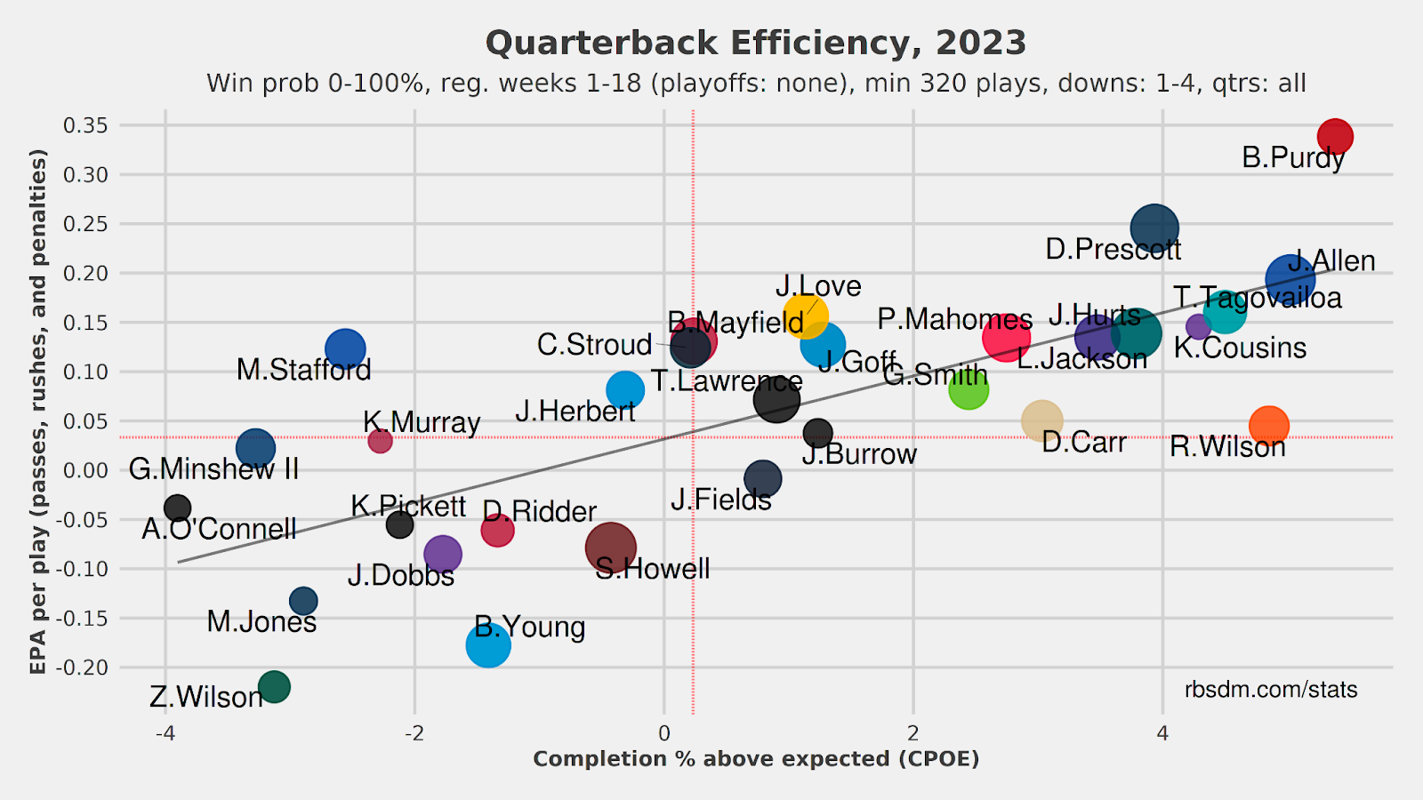 The following data visualizations show quarterback efficiency in 2022 (first) and 2023 (second). Sam Howell wasn’t a great quarterback in his first year of holding a starting position, but he was definitely a downgrade from Taylor Heinicke who held the starting role for the majority of the 2022 season.